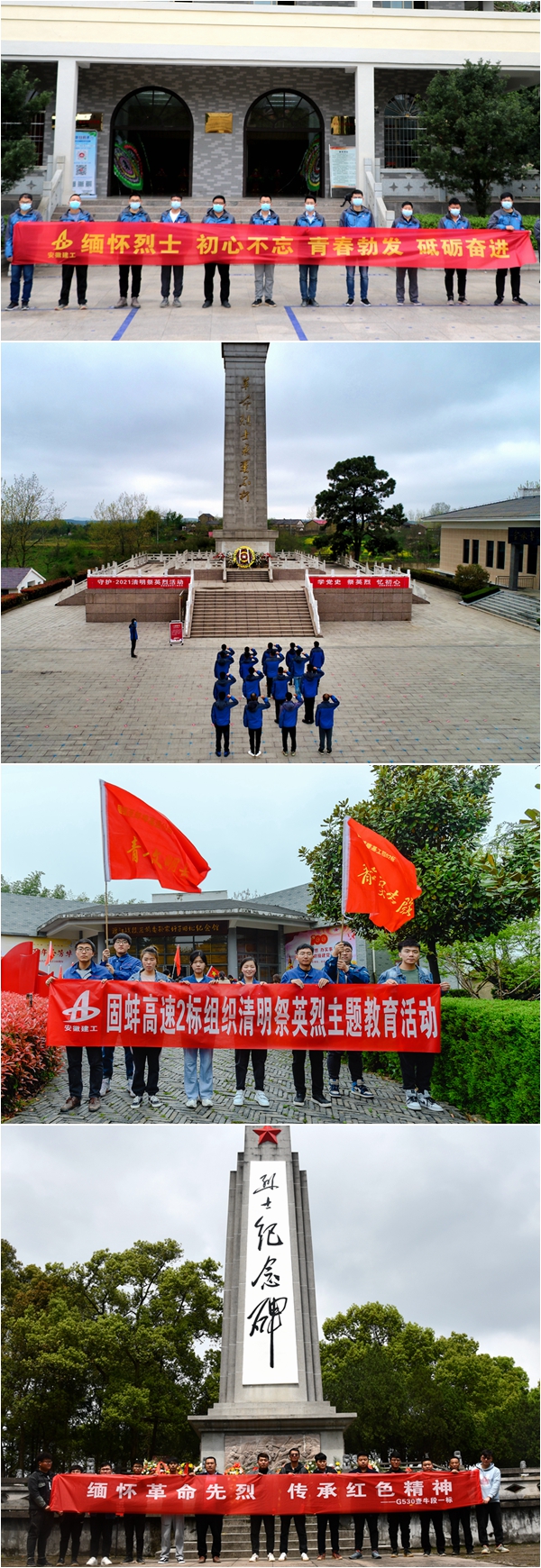 在紅色江西,公司承建的吉康改擴(kuò)建C1標(biāo)項(xiàng)目黨員及團(tuán)員青年前往遂川縣革命烈士紀(jì)念館,學(xué)習(xí)革命歷史,緬懷革命先烈,了解不同時(shí)期革命烈士的先進(jìn)事跡;滁河大橋項(xiàng)目黨支部在全椒周家崗革命烈士陵園開展“緬懷革命先烈,傳承民族精神”為主題的清明祭掃活動(dòng),向烈士紀(jì)念碑敬獻(xiàn)花籃,寄托哀思。固蚌高速2標(biāo)項(xiàng)目部黨支部前往蚌埠渡江戰(zhàn)役總前委舊址紀(jì)念館參觀學(xué)習(xí),開展以“學(xué)習(xí)黨史、不忘初心、牢記使命”為主題的教育活動(dòng); G530查橋至牛磯段一標(biāo)組織員工前往東至縣烈士陵園開展“緬懷革命先烈、傳承紅色精神”清明祭掃活動(dòng);馬鞍山S247項(xiàng)目組織觀看《你記得我,我就活著》主題短片,學(xué)習(xí)黨史精講課程---《永不叛黨》,并積極開展研討交流。
