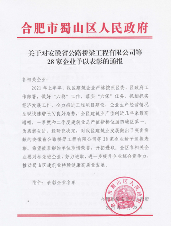 上半年,公司認真謀劃、統(tǒng)籌部署,堅持疫情防控和生產(chǎn)經(jīng)營兩手抓、兩手硬,積極做好“六穩(wěn)”工作、嚴格落實“六保”任務(wù),企業(yè)生產(chǎn)經(jīng)營情況始終保持增長態(tài)勢,為蜀山區(qū)建筑業(yè)總產(chǎn)值指標上半年位居全市首位做出了突出貢獻,為此,蜀山區(qū)人民政府對公司給予通報表彰。下一步,公司將珍惜榮譽,緊緊圍繞“十四五”戰(zhàn)略規(guī)劃,進一步提高競爭力,持續(xù)推進品質(zhì)路橋卓越路橋建設(shè),為推動蜀山區(qū)建筑業(yè)高質(zhì)量發(fā)展作出新的更大貢獻。