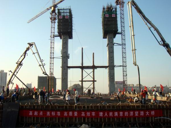 淠望路大橋主橋邊跨長(zhǎng)85m,砼方量約2800m³,鋼筋約120t。為緊緊抓住秋季黃金施工季節(jié),趕在冬季來臨之前完成更多的生產(chǎn)任務(wù)。項(xiàng)目部經(jīng)認(rèn)真研究、周密論證,決定將原計(jì)劃分兩次澆筑的85m邊跨改為一次性澆筑,方量之大在公司歷史上尚屬首次。命令一下,項(xiàng)目部群情激昂、精神振奮、上下一心、紛紛卯足了干勁、準(zhǔn)備大干一把。項(xiàng)目部管理人員全體出動(dòng)齊上陣,幫助工人穿拉鋼絞線;人員組織、材料設(shè)備安排、質(zhì)量控制、施工力量組織、后勤保障等工作科學(xué)周密、井然有序的迅速落實(shí)到位。公司領(lǐng)導(dǎo)更是高度重視,專門為這次大方量砼澆筑在現(xiàn)場(chǎng)召開了生產(chǎn)調(diào)度會(huì),副總經(jīng)理彭申凱、總經(jīng)理助理傅月斌、副總工程師崔林釗等親自到現(xiàn)場(chǎng)督戰(zhàn)。公司還緊急抽調(diào)了合肥市政項(xiàng)目和金桃大橋項(xiàng)目的精兵強(qiáng)將前來鼎力“助陣”。