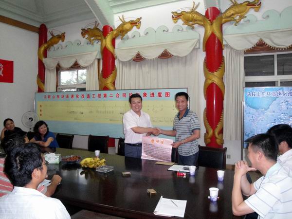 最后,在一陣熱烈的掌聲中,胡主席向我部項目經(jīng)理冷峰遞交了慰問信和慰問金。