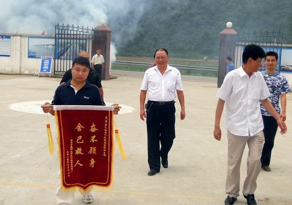 715,公司宜巴09標(biāo)項(xiàng)目部禮炮聲隆隆,喜氣洋洋。宜昌市夷陵區(qū)霧渡河鎮(zhèn)富貴汽修廠為感謝公司員工奮不顧身?yè)尵嚷渌藛T特送來(lái)錦旗,錦旗上寫(xiě)著“奮不顧身,舍己救人”。