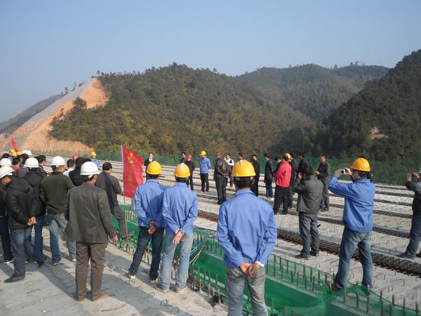隨后,大廣項(xiàng)目辦在我部會議室召開經(jīng)驗(yàn)交流會。全上我部項(xiàng)目總工熊祖發(fā)以投影的方式,將橋面系精細(xì)化施工各道施工工序的做法及注意事項(xiàng)等一一展播,生動形象的講解令與會人員印象深刻。各高駐辦及施工單位也就此次觀摩會發(fā)表了一些感想。隨后,項(xiàng)目辦總工周軍平作總結(jié)性發(fā)言,周總說該橋得到了省質(zhì)檢站的高度認(rèn)可,在肯定了B1標(biāo)項(xiàng)目經(jīng)理部所做出的成績后,也對全線參建單位提出要求,希望通過此次觀摩,各參建單位能取人之長,補(bǔ)己之短,多交流溝通,多相互學(xué)習(xí),將先進(jìn)的施工工藝學(xué)回去,共同提高施工質(zhì)量。最后,項(xiàng)目經(jīng)理羅權(quán)代表項(xiàng)目部對到會的各位領(lǐng)導(dǎo)及同仁表示感謝,并表示將在今后的施工過程中,繼續(xù)秉持“高標(biāo)準(zhǔn),嚴(yán)要求”的理念,快速、高效完成業(yè)主交付的施工任務(wù)。