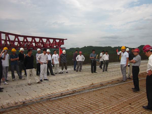 下午15:30,在大廣高速龍楊段項(xiàng)目辦、高駐辦相關(guān)領(lǐng)導(dǎo)帶領(lǐng)下,全線各高駐辦、施工單位主要負(fù)責(zé)人徒步參觀了我標(biāo)江口大橋施工現(xiàn)場(chǎng)。實(shí)地考察中,我標(biāo)項(xiàng)目經(jīng)理羅權(quán)針對(duì)水混凝土橋面鋪裝施工情況作了簡(jiǎn)要介紹,并就部分施工細(xì)節(jié)問(wèn)題與觀摩團(tuán)進(jìn)行了深入交流。